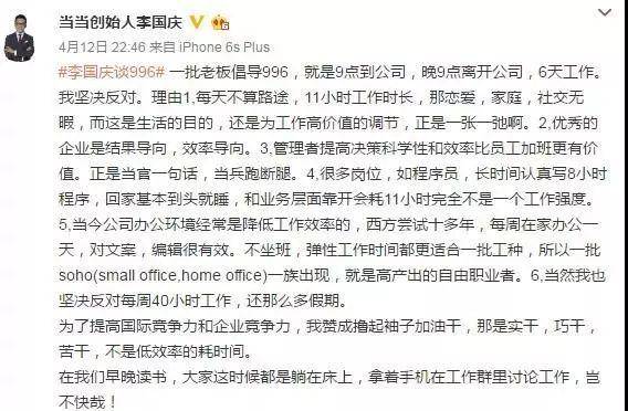 同日,当当创始人李国庆则发微博称,自己坚决反对“996工作制”:“我赞成撸起袖子加油干,那是实干,巧干,苦干,不是低效率地耗时间。”