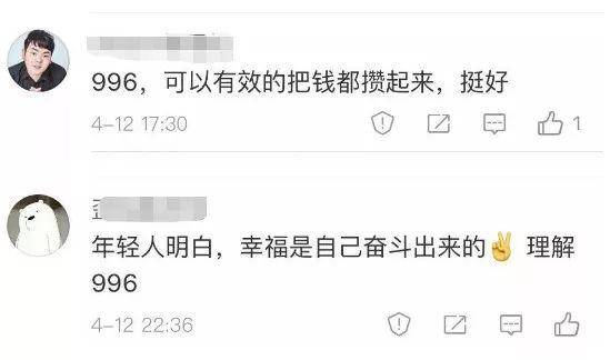 真正的996不是简单的加班,不是单调的体力活,和被剥削没有关系,因为现在的人并不傻,可选择的机会也不少。我觉得真正的996应该是花时间在学习、思考和自我的提升上。那些能坚持996的人一定是找到了自己的热情之处,找到了金钱以外的快乐之处,他们享受自己在八小时以外的学习、思考,探索的路径上,找到自己工作快乐点的人是幸福的,有福报的。为加班工资而996的人是很难持久的。