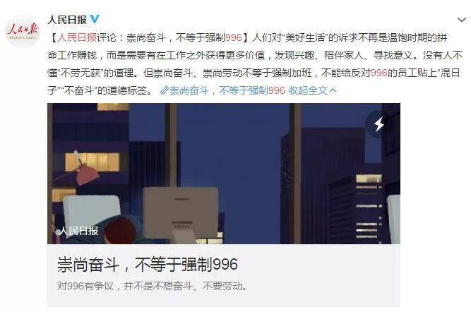 对于“996”,人民日报评论称,人们对“美好生活”的诉求不再是温饱时期的拼命工作赚钱,而是需要有在工作之外获得更多价值,发现兴趣、陪伴家人、寻找意义。没有人不懂“不劳无获”的道理。但崇尚奋斗、崇尚劳动不等于强制加班,不能给反对996的员工贴上“混日子”“不奋斗”的道德标签。