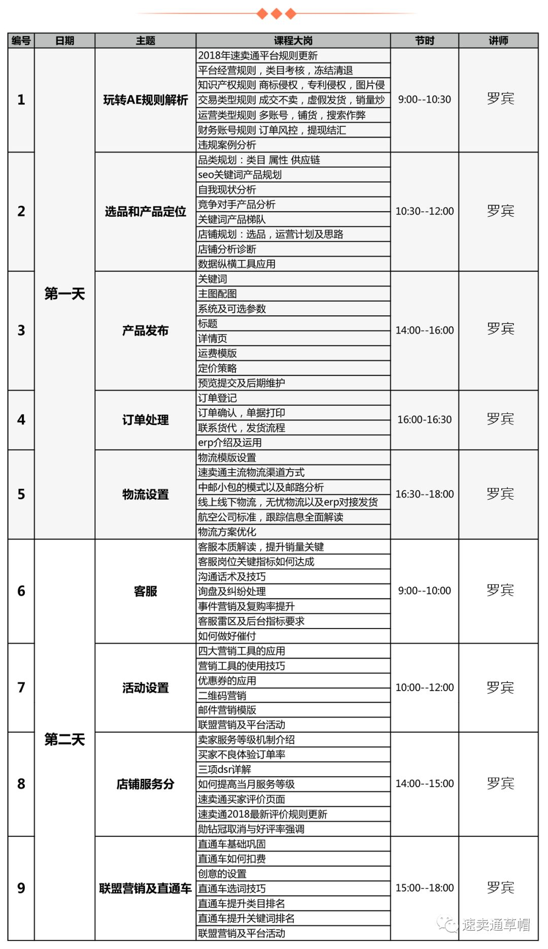 第一天从2019年速卖通平台规则解析起,到选品和店铺的产品定位,讲到店铺产品布局,一个店铺要有引流款、主打款、活动款、利润款与联盟款等!