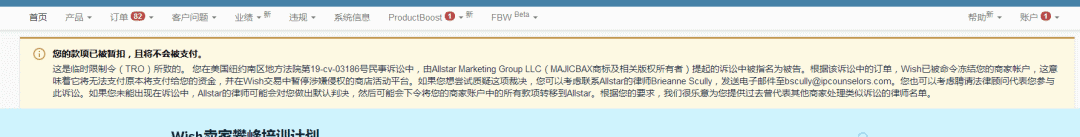 Thisis dueto a Temporary Restraining Order.您在美国纽约南区地方法院第19-cv-03186号民事诉讼中,由Allstar Marketing Group LLC(MAJICBAX商标及相关版权所有者)提起的诉讼中被指名为被告。根据该诉讼中的订单Wish已被命令冻结您的商家账户。