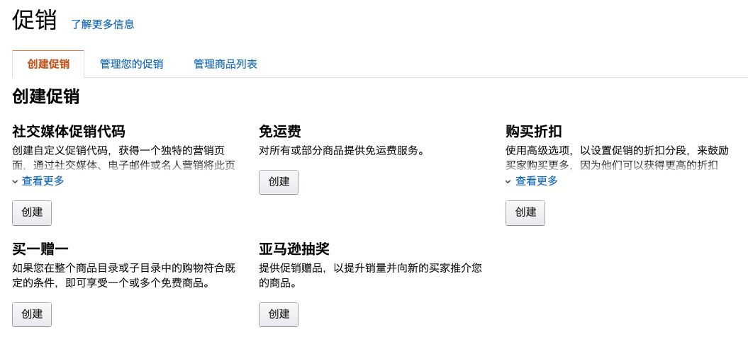 如果进入该页面,又会有多种设置,包括社交媒体促销码、免运费、购买折扣,买一赠一,和亚马逊抽奖等。