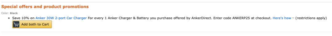 但细心的卖家会发现,就促销设置来说,中小卖家往往已经不再使用,而相当数量的大卖家却还在使用,比如,下图中Anker的店铺中,就经常会有这种促销设置。