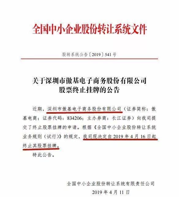 根据官方公告显示,因自身经营发展需要以及长期战略发展规划,傲基电商于3 月12 日召开年第二次临时股东大会。审议通过了《关于申请公司股票在全国中小企业股份转让系统终止挂牌的议案》。3月22日公司向全国中小企业股份转让系统有限责任公司报送了终止挂牌的申请材料,公司股票自2019年4月16日起在全国中小企业股份转让系统终止挂牌。