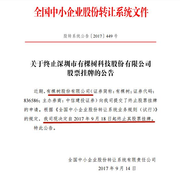 2017年9月14日,根据全国中小企业股份转让系统有限责任公司发布的公告:有棵树股份有限公司(证券简称:有棵树;证券代码:836586;主办券商:中信建投证券)向我司提交了终止股票挂牌的申请。根据《全国中小企业股份转让系统业务规则(试行)》的规定,我司现决定自2017年9月18日起终止其股票挂牌。