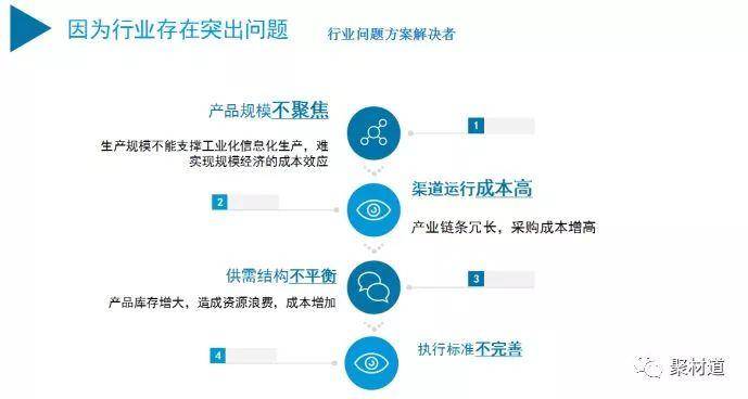 谈到为什么要做聚材道平台,刘殿超表示是因为目前行业存在的突出问题,聚材道要做行业问题的方案解决者。他指出,一个生产企业要想做好、做大、做强,无外乎两个手段:抓好技术研发和营销。目前行业存在四方面的突出问题: