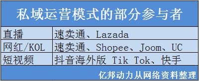 上述平台仅是进行“私域运营”布局的冰山的一角。亿邦动力了解到,目前,包括阿里旗下的Lazada、东南亚电商平台Shopee等多家中国卖家接触紧密的出口电商渠道均开展了如直播、网红/KOL博客等内容营销模式,并对平台上的卖家进行开放。