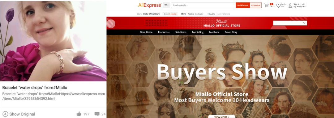 (左图的Zara Sneg是速卖通上的一位来自东欧拥有5.08万粉丝的网红,其通过推文的链接把粉丝引入右图店铺的商品页面)