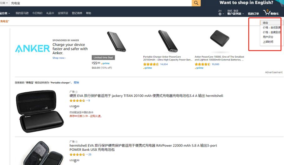 (在亚马逊上搜索充电宝 其排序可通过“用户评分”、“商家时间”和“价格”)