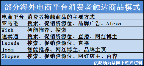 (从表格上看,亚马逊、Wish等平台更多依靠推荐模式且不断投入迭代其算法技术,而速卖通、Lazada、Joom和Shopee则已经开始布局以社交电商为标志的私域运营模式了)