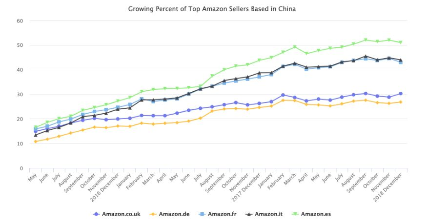 两年来,亚马逊市场上来自中国的成功卖家数量翻了一番。36%的畅销产品现在位于中国,而两年前这一比例为15%。所有亚马逊市场都是如此,包括美国和欧洲国家,如英国和德国。