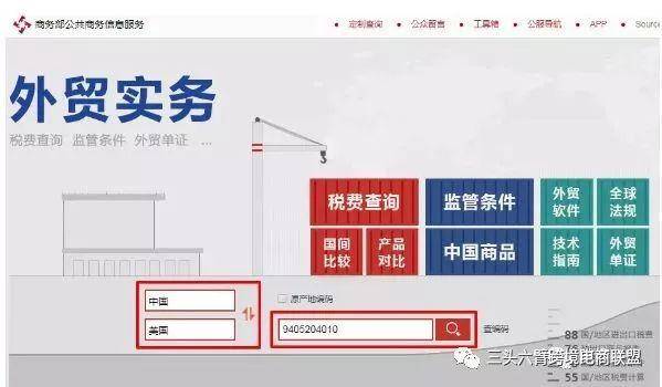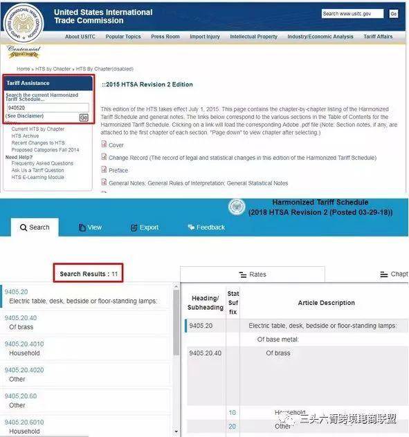 查询办法:进入上述网站,在Tariff Assistance项下Search the current Harmonized Tariff Schedule...下的搜索框中输入输入中国HS CODE的前六位数,如台灯940520****,搜索结果页面的左边框有详细的HTS CODE,根据自己的产品选择HTS CODE。