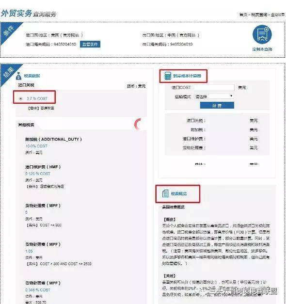 大家可以看到查询结果,非常清楚、详细,竟然还有到岸成本计算器,以及美国的税费概览知识科普。可以说是十分有用了。