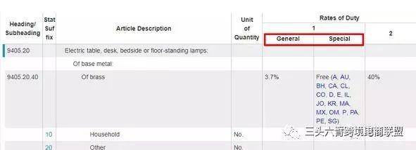 “1”中的“General”指从世界绝大部分进口产品的关税(含中国),“Special”指和美国有相关自贸协定国家的进口关税(经常有free的,可是那不是给我们享受的);