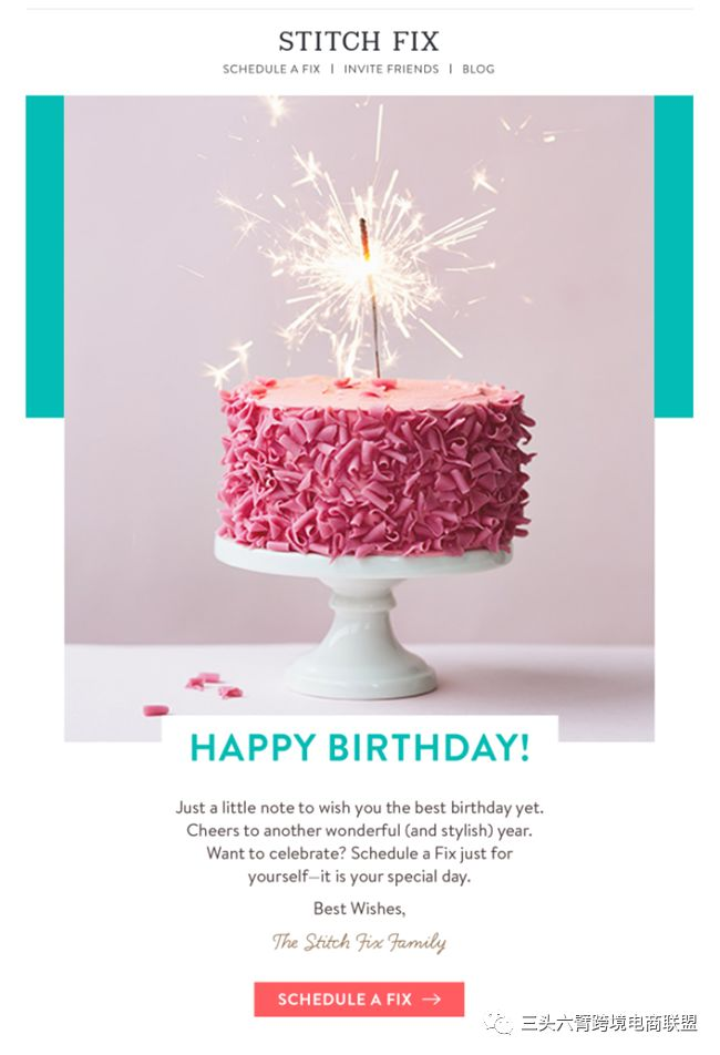 零售商StithFix也十分重视生日邮件,保持生日礼物的主题不变,借机提醒客户疯狂血拼以犒劳自己。