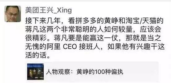 当时,王兴在朋友圈转发了《黄峥的100种偏执》一文,并配上文字表示:接下来几年,国内电商之战将在拼多多的黄峥和淘宝/天猫的蒋凡之间展开,蒋凡能赢的话,就是阿里当之无愧的接班人!如果他有兴趣的话。
