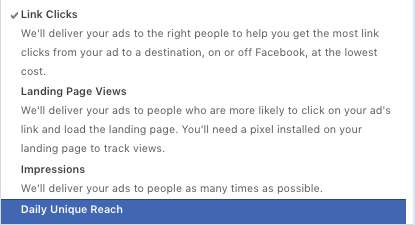 一旦你选择了不同的广告目标,那么就会有不同的广告投放优化的选项让你选择,他们分别是