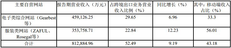值得注意的是,报告期内,跨境通跨境出口自营网站(含移动端)实现营业收入812,884.96万元(约81亿元),占公司跨境出口业务营业收入的52.49%。 跨境出口主要自营网站(含移动端)营业收入结构如下: