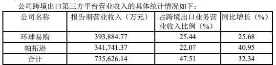 报告期内,跨境通跨境出口第三方平台营业收入达到 735,626.14万元(约73亿元),占跨境出口业务营业收入的47.51%。