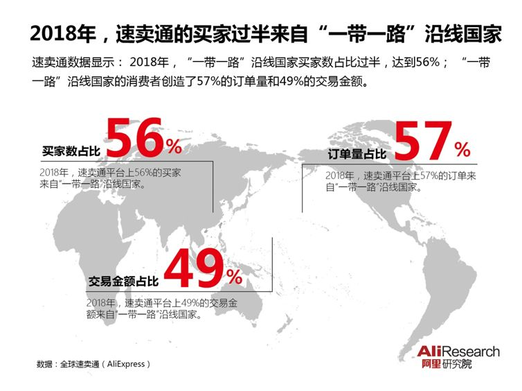 2018年,速卖通平台上56%的买家来自“一带一路”沿线国家和地区,这些地区的消费者贡献了速卖通平台57%的订单量和49%的交易金额。