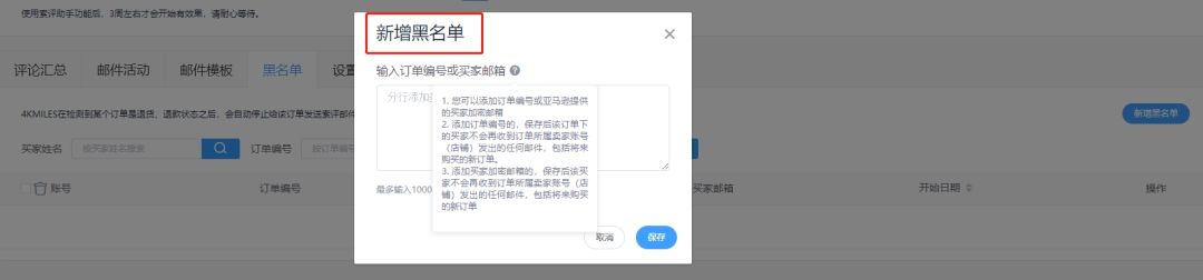 怎么避免把邮件发给这部分买家?在4KMILES邮件系统里,收集到这部分买家的站内加密邮箱或者订单编号,就可以放入邮件黑名单永久屏蔽。
