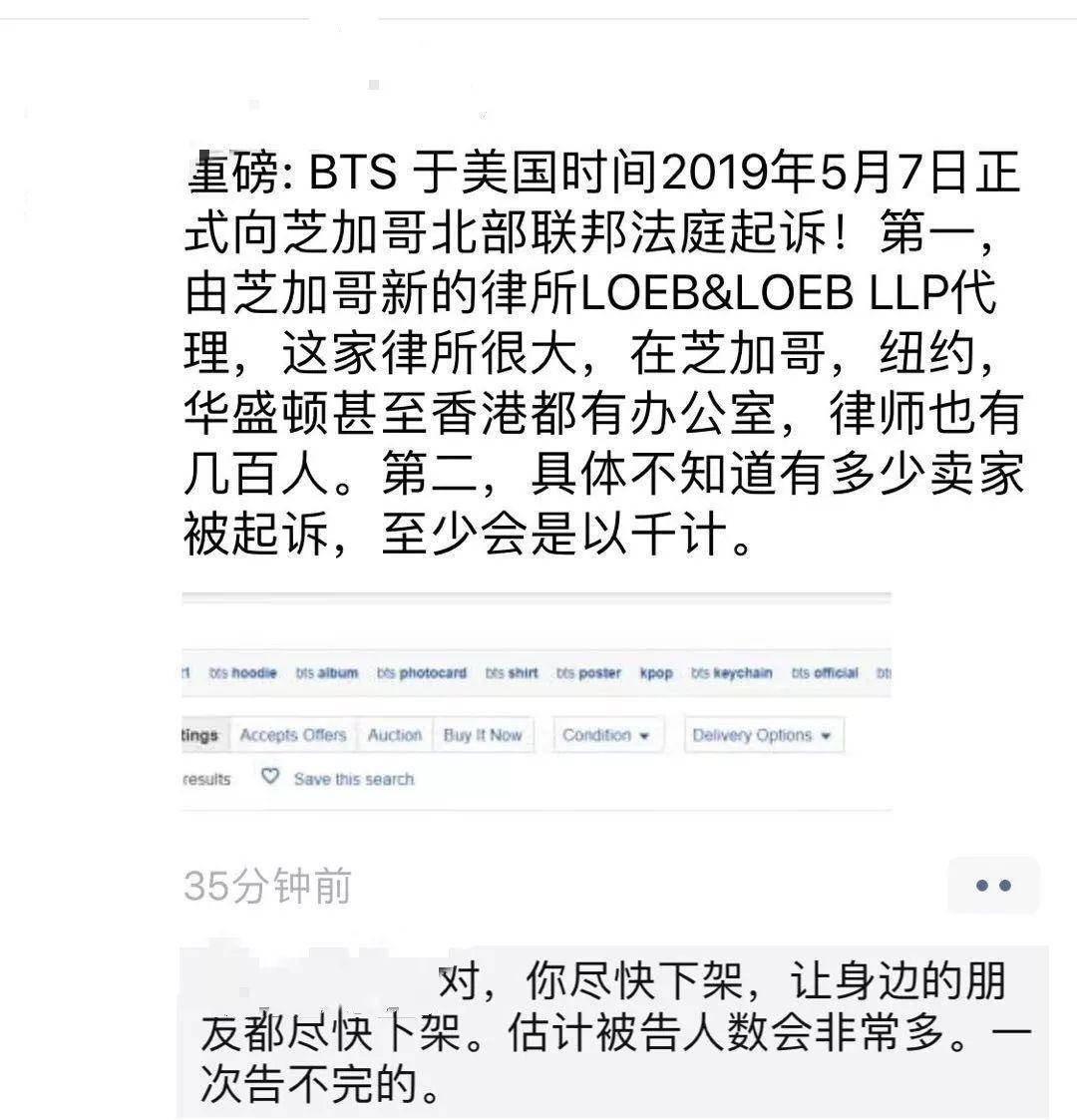 前晚,有卖家爆料,防弹少年团(BTS)周边产品涉及侵权假冒,一家位于美国芝加哥的新律所LOEB&LOEB LLP代理了该案件,并在美国时间5月7日已立案。据业内人士预测,此次案件影响范围广泛,可能会有上千家以上的店铺受到影响。