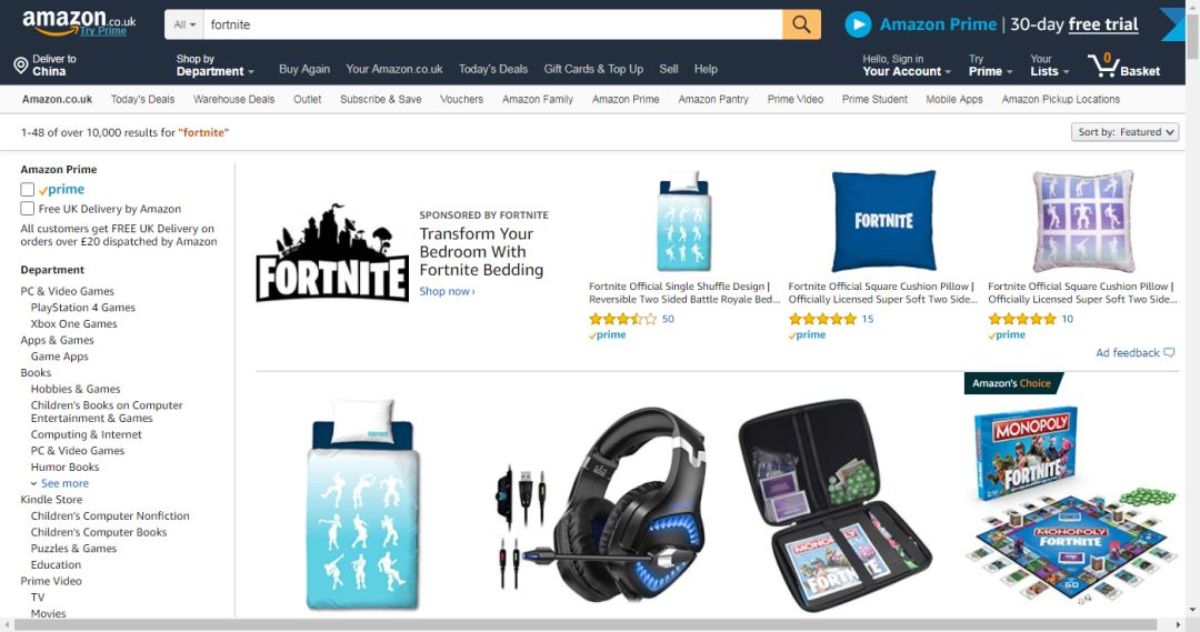 据说,fortnite 堡垒之夜的周边产品每日销售额高达4000刀,由于在售品类很多,涵盖服装、电子产品、配饰、箱包等品类,因此卖家很容易侵权。本次侵权案例涉及了25类服装和28类玩具公仔,根据各大平台的搜索结果,亚马逊、eBay、Wish等平台仍有大量侵权商品。