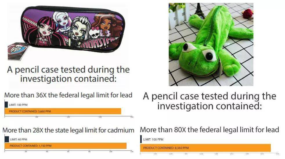 特别值得一提的是,一些卖家的铅笔袋中含有大约8500ppm的铅,是法定限量的80多倍。在一项测试中,一个蜘蛛侠铅笔袋的含铅量是法定限量的40倍,镉的含量是法定限量的23倍。