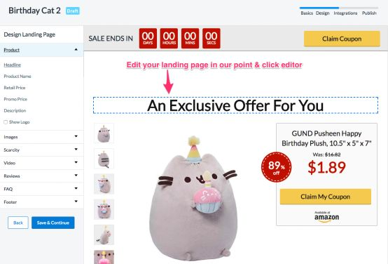另外,我们的着陆页上面就可以直接挂一个产品图片以及还不错的折扣作为吸引,当然领取折扣的方式是通过提供邮箱或者电话才可以领取,类似拿你的邮箱来换我的折扣码了,这里特别说明一下,这种模式获取的邮箱就是真正的许可式邮件营销,直接发邮件送达率和打开率都很高,和那种你去买邮箱或者扒邮箱去做spam那是完全不一样的。所以,这些邮箱就是你的客户沉淀了,当邮箱积累到一定程度的时候,你再去推新品是不是就很简单了,直接群发带折扣码的邮件即可了,而且这可是站外信哦,想怎么发就怎么发的。另外,为了方便大家理解,可以看看下图通过landing cube这个工具做出来的landing page着陆页,借助工具来操作是非常简单的,几分钟就能生成一个landing page: