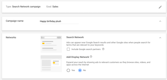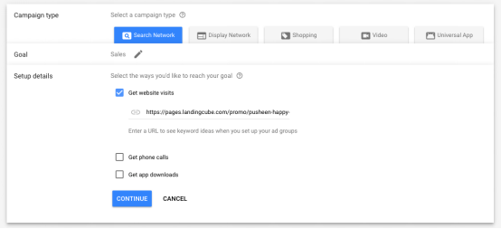 选择好我们的投放目标,然后键入之前弄好的landing page的URL, 这里我们是直接用的第三方工具host,你也可以用自己的独立站域名也是OK的。另外不要忘了disable 这个选项 “Include Google search partners and Add Display Network”.