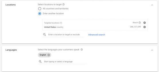 接下来,别忘了选择我们的目标客户的地点和语言,这里就根据你目标客户真实情况来即可: