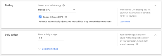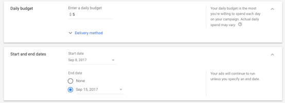 完成上一步以后,选择我们的竞价策略,这里其实和亚马逊PPC很像的,亚马逊PPC也是需要来确定bidding strategy,你可以理解为Google的搜索广告是高级版的亚马逊PPC,都是相通的。另外就是选择预算以及广告开始和截止日期。