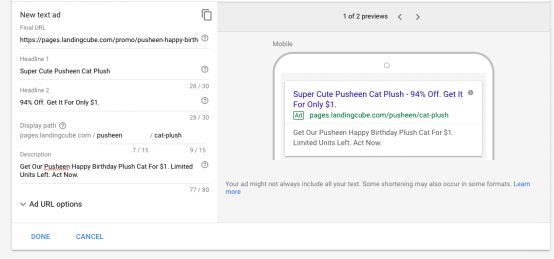 下面的事情,就是根据广告的模拟展示效果(preview)来进行针对性调整了,目的还是尽可能的提高广告的CTR和CVR: