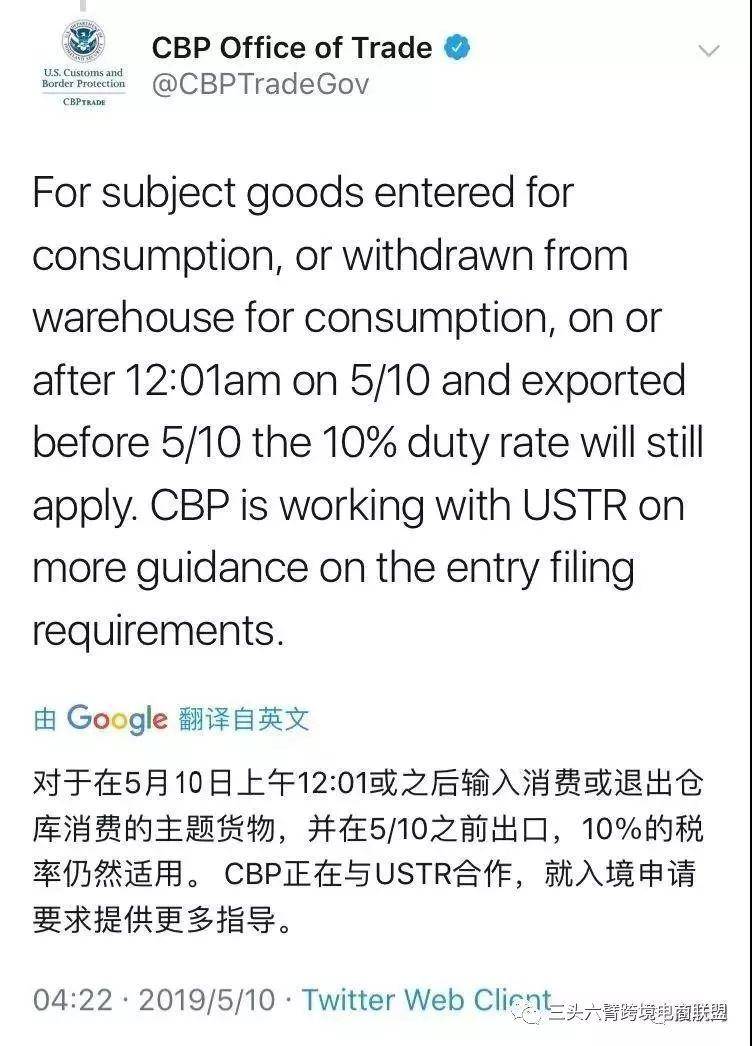 根据CBP这份正式通知,只要在5月10日前从中国出口了,即使货物还未抵港,仍可按照10%税率征收!