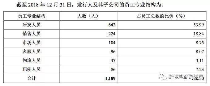 和大多数销售导向的跨境电商公司不同,Anker在产品研发上投入巨大,Anker也把产品研发设计能力定义为公司核心竞争力之一。2018年,Anker研发费用投入为2.87亿元,占营业收入 5.48%。截至2018年底,公司研发人员 642 名,占总人数 的 53.99%,高于其他所有职能岗位人数的总和,拥有境内外专利共计 443 项。