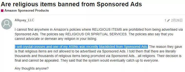 这位卖家担心因为该政策变更销量会进一步下降。广告是促进亚马逊销售的关键因素,因为它们提高了广告产品在平台上的知名度,但新政策将有效禁止所有宗教产品卖家推广其产品。截至上周五下午,该卖家的广告仍处于暂停状态。