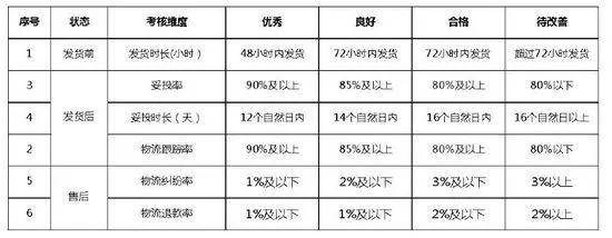 对于商家的物流服务标准,将以发货时长、妥投率、物流跟踪率、物流纠纷率等因素为考核维度,划分为优秀、良好、合格、待改善四个评级。