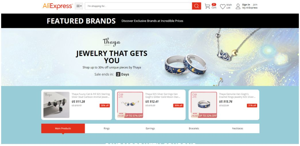 (速卖通上一个名为Thaya的饰品品牌的FeatureBrand Day页面)