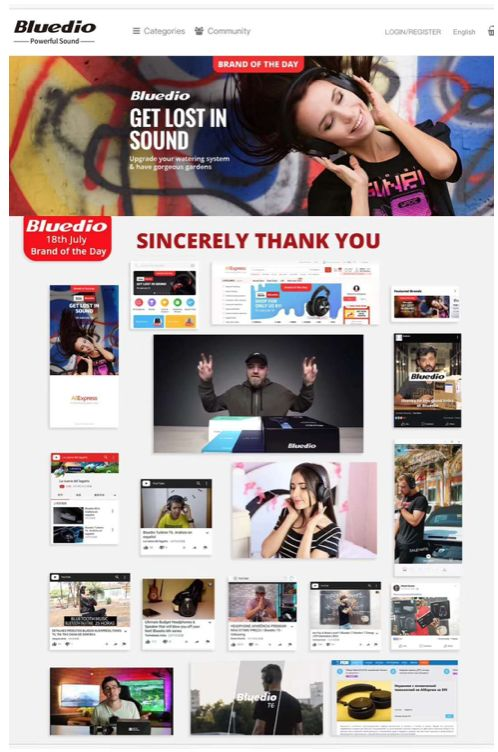 Bluedio的超级品牌日于去年7月18日举行。当天,Bluedio完成了5分钟销售额达10万美元,40分钟售出超过10000单,单日销售额高达88万美元(相当于Bluedio参加超级品牌日前3个月的销量总量)的成绩。