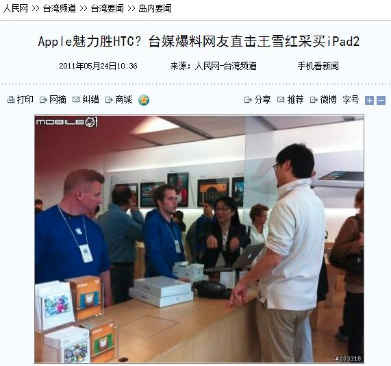 当年五月,HTC发布了首款平板电脑,带动股价连涨几天。面对这样的形势,王雪红心情很不错,抽空与丈夫去逛了苹果店,消费了十几万新台币,除了Apple TV和MacBook之外,还买了竞品iPad。