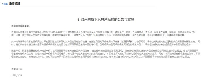 速卖通平台针对乐拼旗下玩具产品的的公告与宣导,主要内容如下: