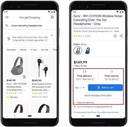 新版本的Google Shopping变身为零售中心,让人们可以搜索产品,并为他们提供从零售商网站、附近实体店或谷歌购买产品的选择。如下图所示,用户可以看到一个蓝色的购物车图标,将产品添加到购物车中。