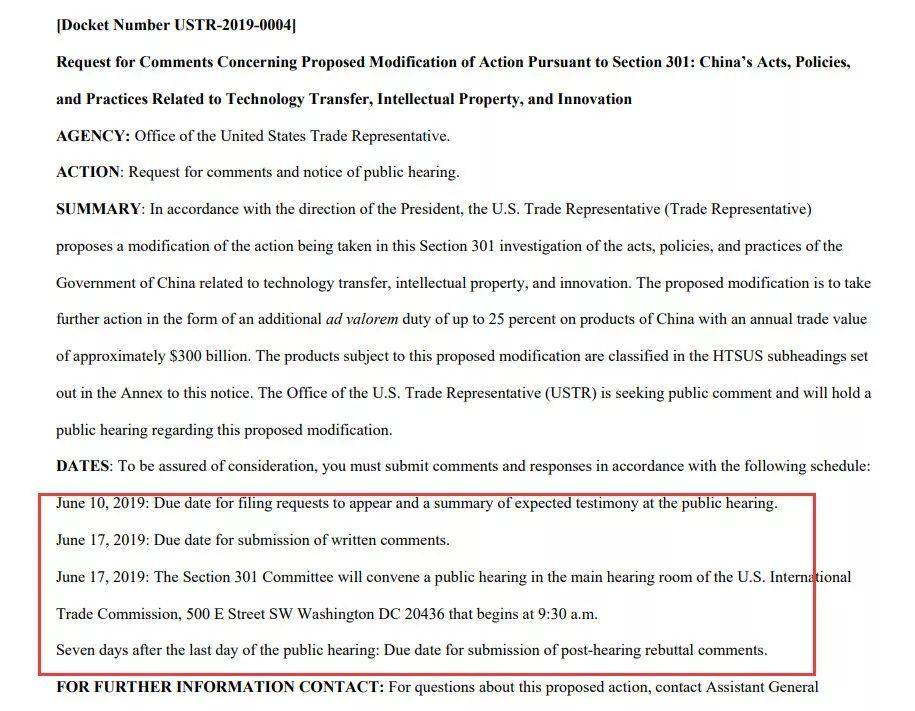 将于6月17日就这份清单举行公开听证会,并停止提交书面意见,USTR要求6月10日之前提交公开听证会证据与材料,6月24日截止收集意见。值得注意的是,此次征求意见的期限明显短于以往对中国商品开征关税的征求意见期限,预计听证会结束后将正式开始加征此批关税!
