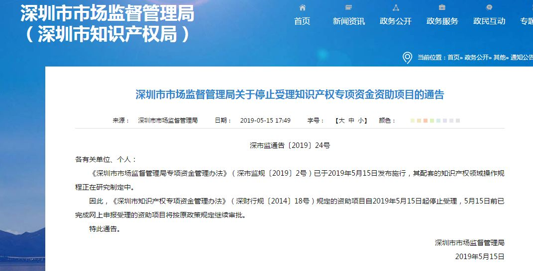 因此,《深圳市知识产权专项资金管理办法》规定的资助项目自2019年5月15日起停止受理,5月15日前已完成网上申报受理的资助项目将按原政策规定继续审批。