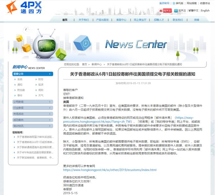 接香港邮政通知,香港邮政于2019年5月10日宣布,应美国政府要求,所有从本港寄往美国的邮件(除小型及大型信件外)由6月1日起须于投寄前提交英文电子报关数据,没有电子报关的邮件将不可寄到美国。