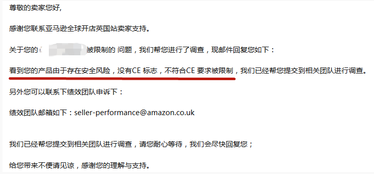 小编在论坛上看到一位卖家说自己销售的产品被留了一个差评,两天后收到亚马逊下架产品的邮件,邮件中讲到,卖家的产品存在安全风险,没有CE标志才被下架的。