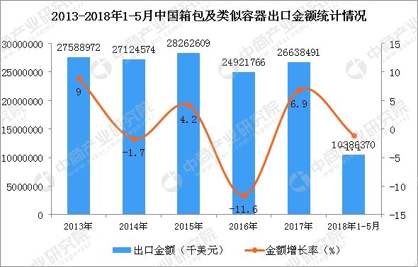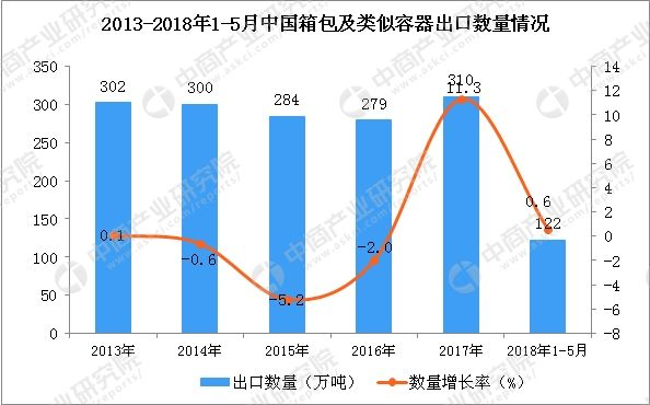 据中商产业研究院数据库数据显示,2018年1-5月中国箱包及类似容器出口122万吨,同比微增0.6%。纵观2013-2017年我国箱包出口量情况,五年间出口量整体波动不大,年均复合增长率为0.65%。