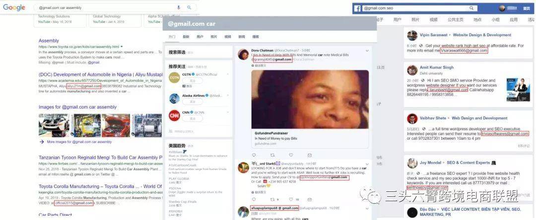 实操方法:打开Facebook、Twitter或者Google,输入关键词和对应的邮箱后缀,点击搜索,手工一个个查看对应的邮箱,然后复制粘贴到表格里面。