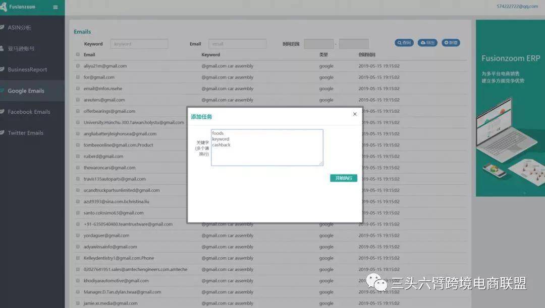 像上面这样手工一个个操作需要耗费大量的时间,怎么能快速获取批量邮箱?英华方舟研发针对这种情况研发了一款邮箱爬取工具Fusionzoom tools,可用于Facebook、Twitter、Google多个平台爬取邮箱,具体效果如下图所示: