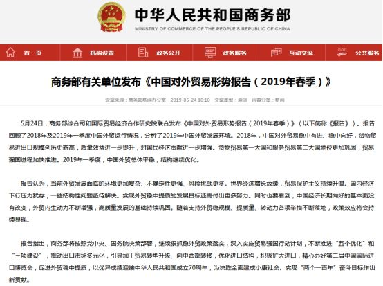 近日,据悉,商务部综合司和国际贸易经济合作研究院联合发布《中国对外贸易形势报告(2019年春季)》(以下简称《报告》)。报告回顾了2018年及2019年一季度中国外贸运行情况,分析了2019年中国外贸发展环境。2018年,中国对外贸易稳中有进、稳中向好,货物贸易进出口规模创历史新高,质量效益进一步提升,对国民经济贡献进一步增强。货物贸易第一大国和服务贸易第二大国地位更加巩固,贸易强国进程加快推进。2019年一季度,中国外贸总体平稳,结构继续优化。